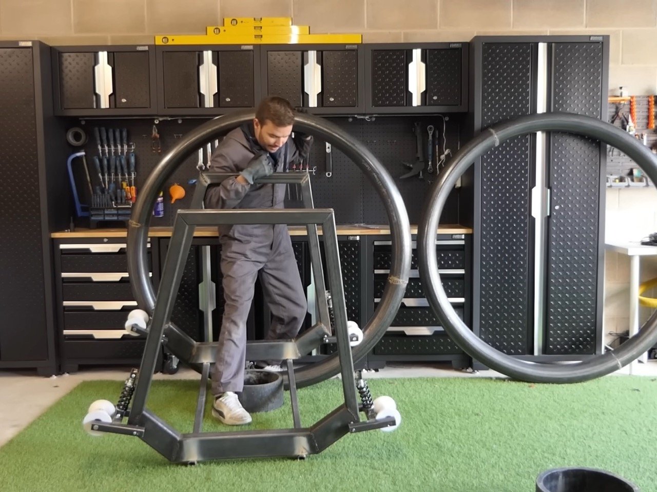 Barker’s approach to the rebuild borders on industrial overkill. The steel tubing for the rings measures 5mm thick and 100mm wide, sourced from a Sheffield metalworker who reported extraordinary difficulty even cutting and rolling the material. Each completed ring weighs 60 kilograms. For context, that’s heavier than most complete electric bicycles. The builder openly admits to over-engineering: “Have I gone over the top? Yes. Am I scared it’s going to run away with all the inertia? Yes. Is it going to bend? Absolutely not.” This kind of self-awareness is refreshing because it acknowledges the fundamental problem with amateur fabrication. When your welding skills are questionable and your measurements keep coming out wrong, you compensate with materials that could probably survive a tank rolling over them.