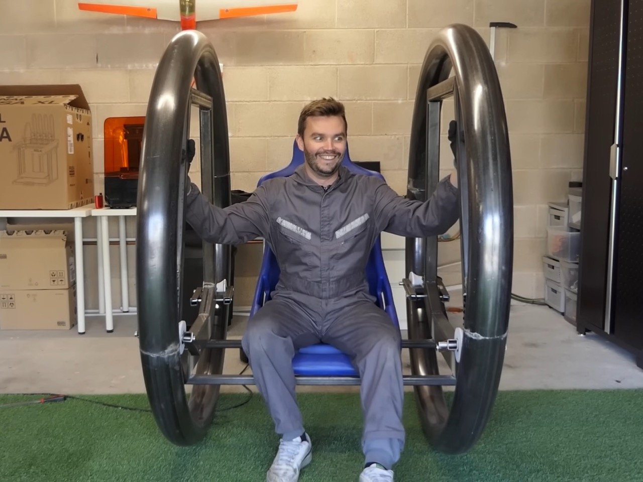 For the uninitiated, a diwheel (or dicycle, depending on who you ask) consists of two large rings with the rider sitting in a frame between them. Unlike a monowheel, which requires constant balance and gyroscopic forces to stay upright, a diwheel is naturally stable. The outer rings rotate around a stationary inner frame via roller bearings, and the whole thing steers like a tank: differential power to each wheel. It’s the kind of vehicle that makes you wonder why we ever settled on boring old bicycles, right up until you try to navigate a doorway or park the thing.