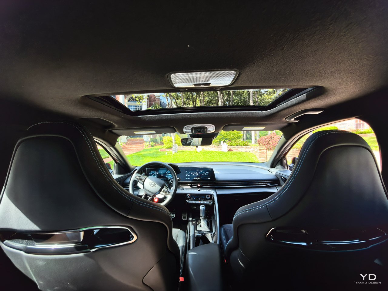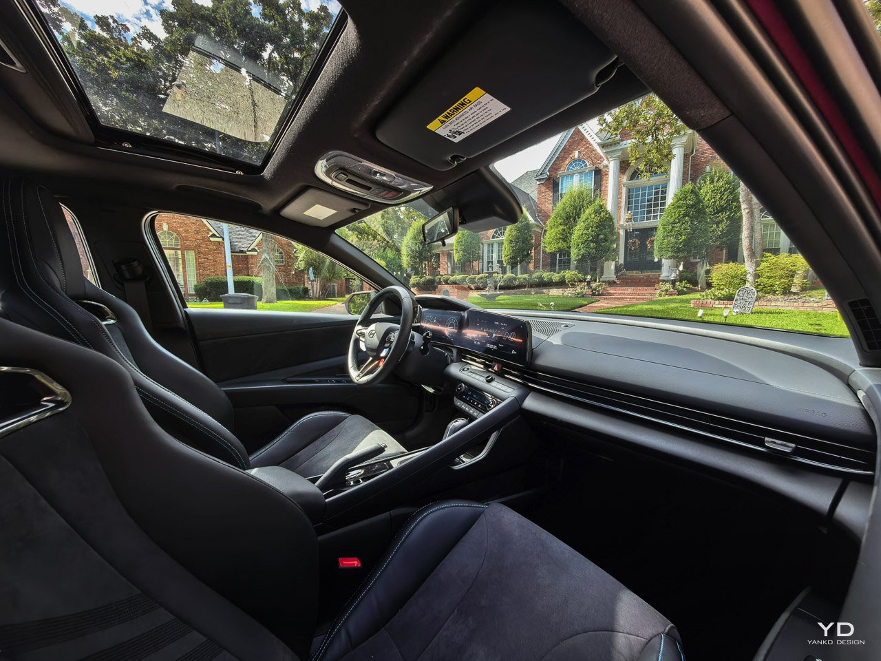 Air is managed with purpose outside; inputs are managed with equal intent inside. The N-mode buttons live exactly where your thumbs fall, the paddles are immediate, and the thick-rim wheel keeps your hands quiet and steady. Grippy suede on key touch zones favors control over flash. The heavily bolstered seats don’t just photograph sporty. They hold you when lateral loads build, without punishing you in the commute. Seat bolstering and hip-point height align with the car’s low roll attitude, so you feel the chassis working rather than bracing against it.