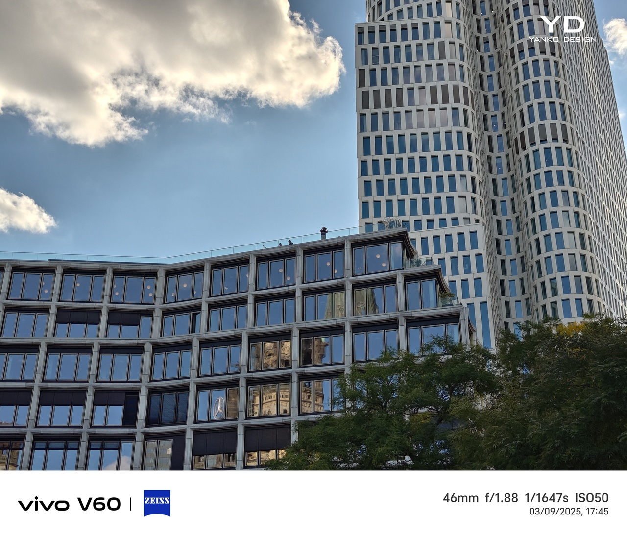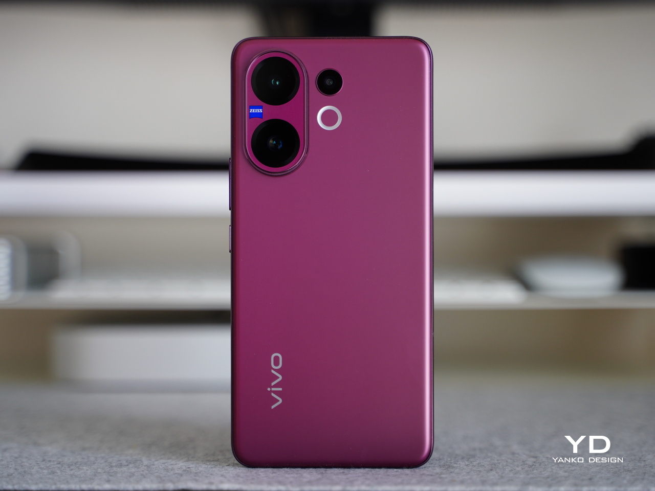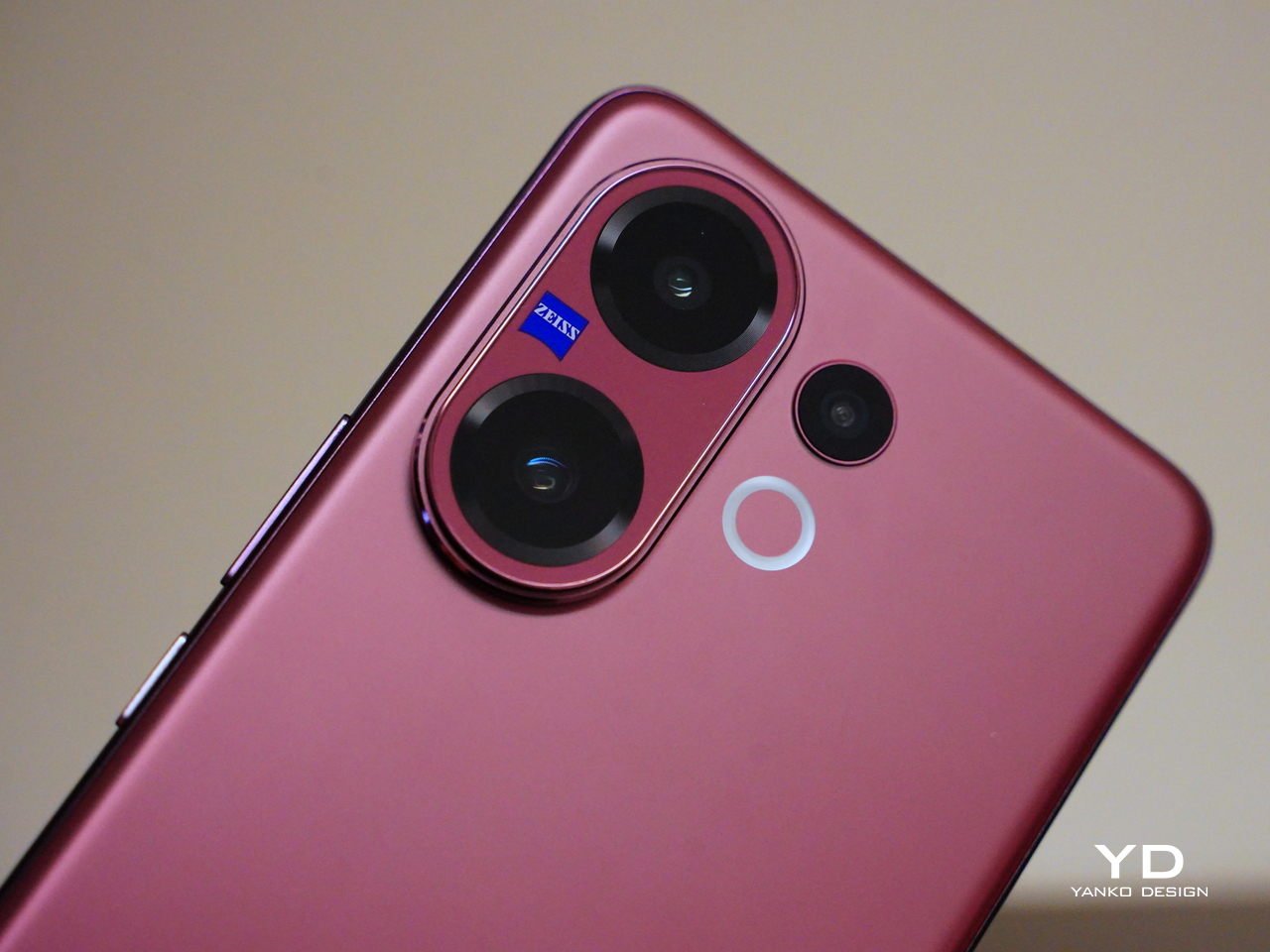 The camera setup is arranged cleanly across the upper-left corner. The main and telephoto cameras are stacked vertically within an oval-shaped camera island, with the Zeiss logo placed neatly between them. Next to this module, the ultra-wide camera and LED flash are aligned vertically in a separate column, keeping the layout balanced and visually distinct.
