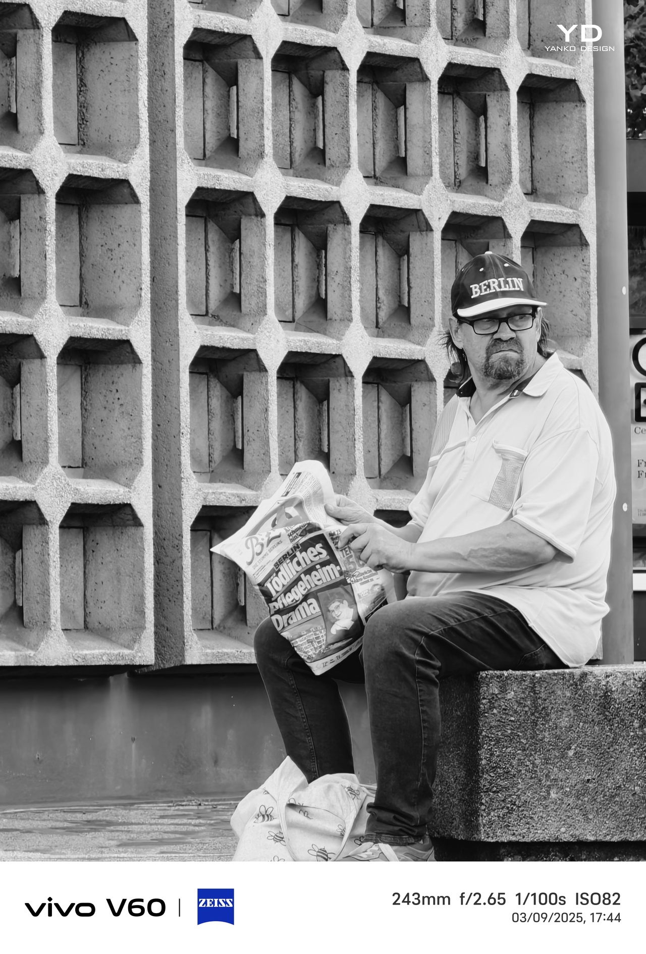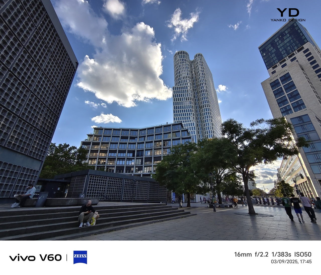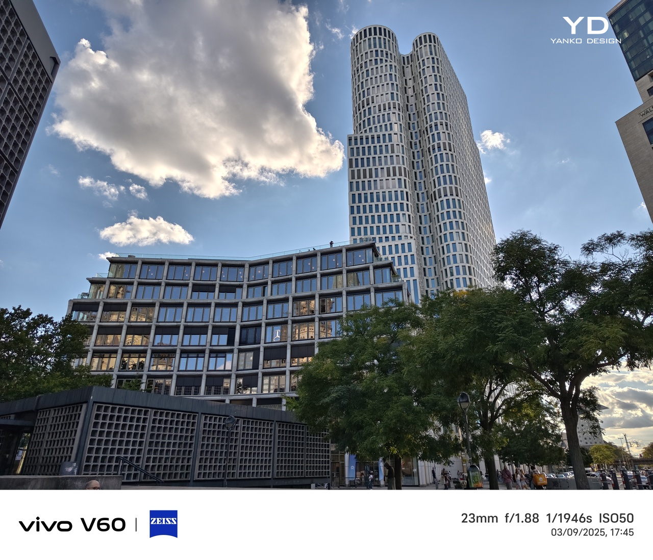 The camera setup is arranged cleanly across the upper-left corner. The main and telephoto cameras are stacked vertically within an oval-shaped camera island, with the Zeiss logo placed neatly between them. Next to this module, the ultra-wide camera and LED flash are aligned vertically in a separate column, keeping the layout balanced and visually distinct.