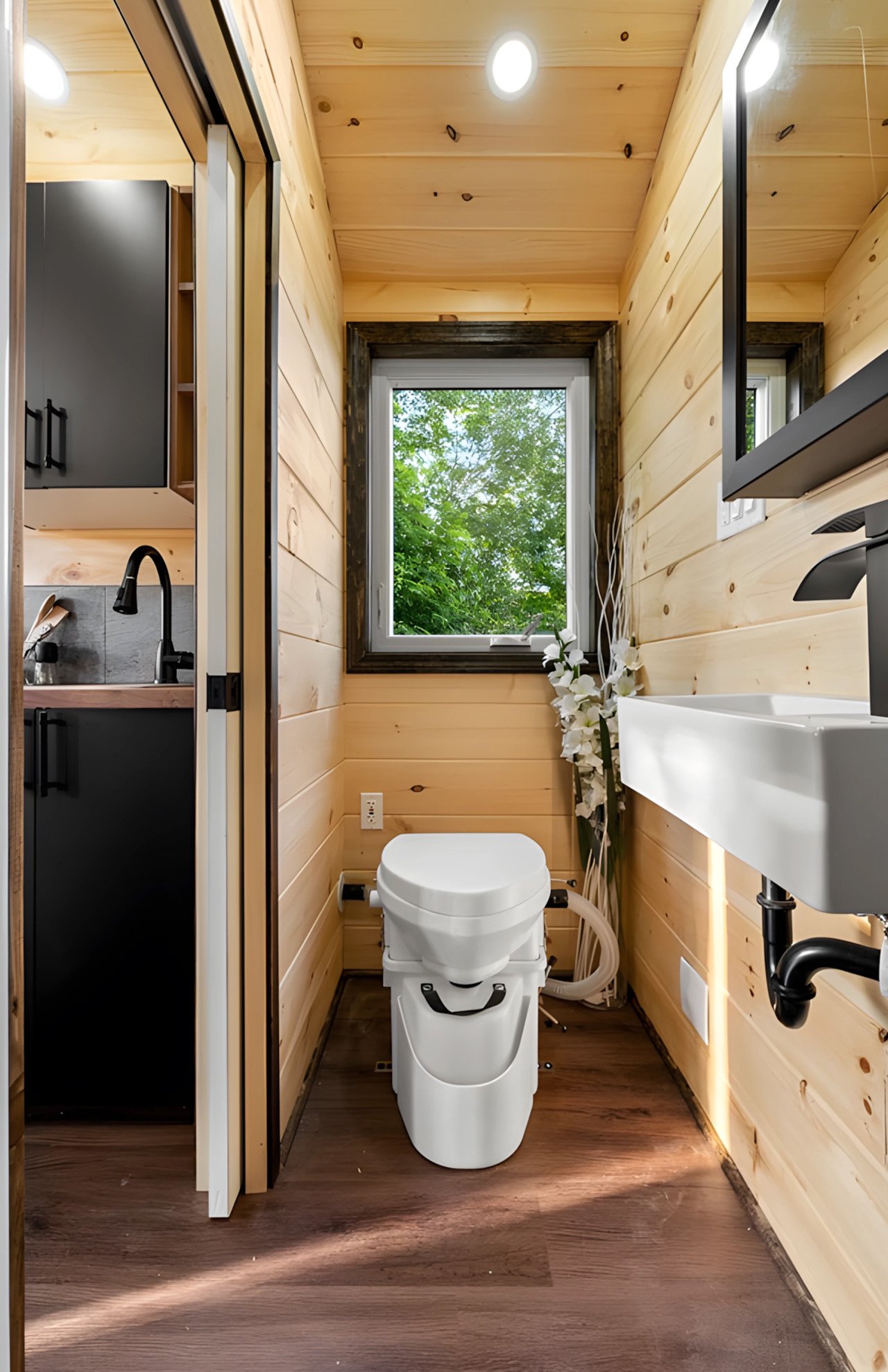 Full-length shelving spans two walls, offering surprising storage capacity for personal belongings. The kitchen, though compact, includes essential appliances and maintains the model’s refined aesthetic. The bathroom features a composting toilet as standard, though buyers can upgrade to a flushing model for those preferring conventional amenities. Dimmable LED ceiling lights and a ceiling fan provide comfortable illumination and air circulation throughout the space.